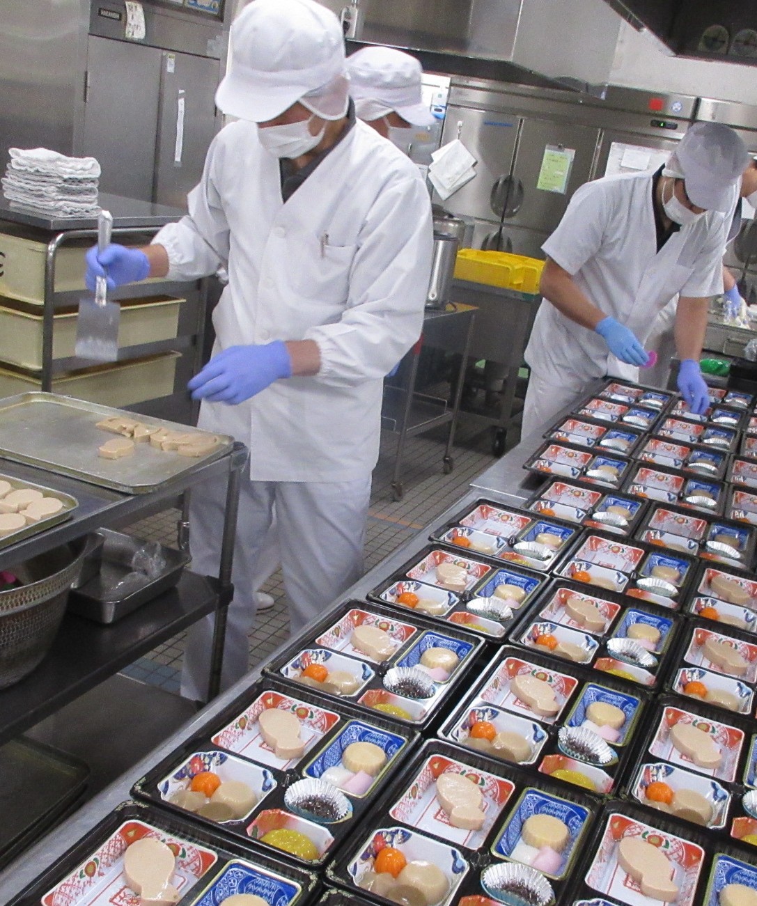 給食センターでは、ご利用者の「美味しかった。ありがとう。」の声を糧に、給食センター以外の専門職とも話し合いながら、日々“食”と向き合っています。